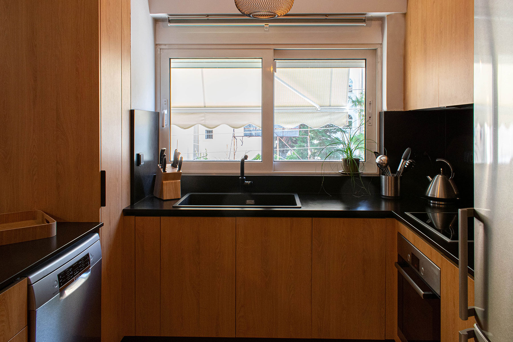 Κουζίνα σε μοντέρνο ύφος με πλάτη και πάγκο από τεχνογρανίτη.